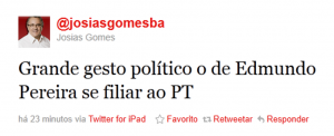 O deputado federal baiano Josias Gomes (PT) acabou de divulgar em sua conta do twitter que o ex-vice-governador de Jaques Wagner (PT), Edmundo Pereira, antes vinculado ao PMDB, se filiou ao PT nesta sexta-feira. Pereira foi vice entre os anos de 2003 e 2006, já foi prefeito da cidade de Brumado por três vezes, foi deputado estadual e na última campanha, em 2010, fez parte da chapa majoritária na candidatura de Geddel Vieira Lima ao governo do Estado. Edmundo havia se desligado do PMDB desde agosto deste ano e até então não estava filiado a nenhuma legenda. (Victor Pinto/ Política Livre)